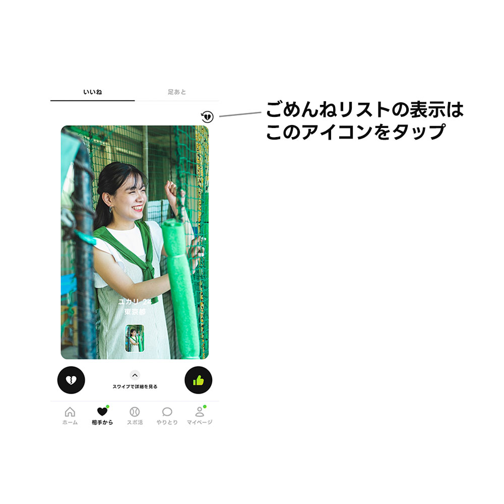 ごめんねリストは「相手から」→「いいね」画面右上のアイコンをタップすると表示できます。